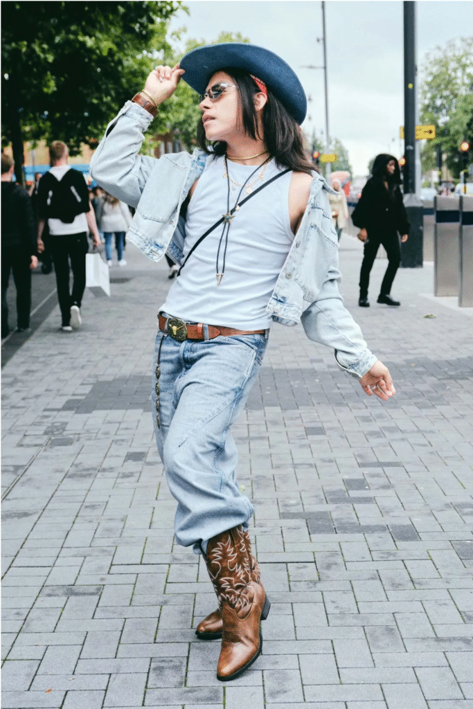 - Her clothing reflects a modern interpretation of Southern cowboy culture and a sense of belonging.