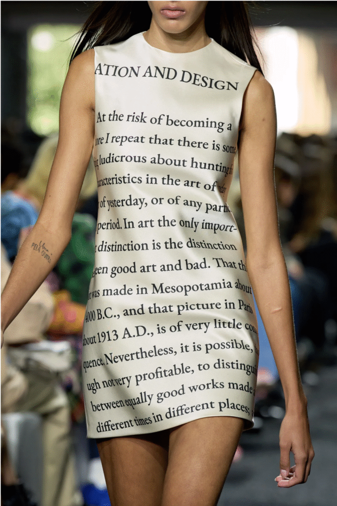 JW Anderson draws inspiration from the writings of Bloomsbury School art critic Clive Bell, incorporating text and philosophical reflections into its clothing, reflecting the designer’s unique insight into the trends of fashion in the coming decade. Text, as a visual element, reminds viewers to look beyond the surface and delve deeper into the inner workings.