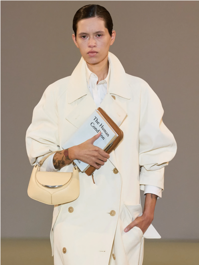 Designer Danielle Delcore boldly frames intellectual women as the theme of her collection. Her selection of books, including Mary Shelley’s Frankenstein, Virginia Woolf’s To the Lighthouse, and Hannah Arendt’s The Human Condition, explores environmental, identity, and social issues. This interdisciplinary design perspective transforms the fashion show into a feast of ideas.