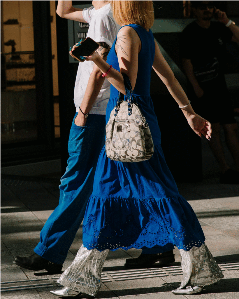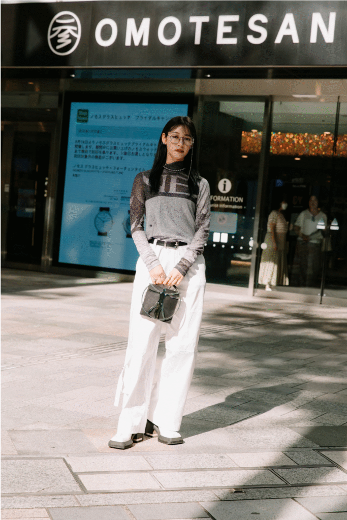 Tokyo street style embraces layering. Whether it’s sneakers paired with loose overalls or a dress and jacket, street style is full of flexible and playful expression. Combining practicality with fashion trends, it demonstrates the wearer’s balance between comfort and aesthetics.